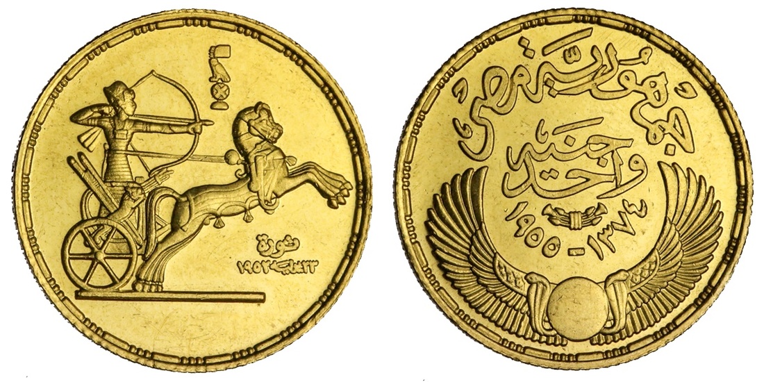 Egypt. Republic. Gin'ey (Pound) AH 1374 - 1955. 3rd Anniversary of the Revolution. Ramses the Great drawing bow in war chariot right, hieroglyphics above, anniversary legend below, rev. Value and date, Gamhuriyya Misriya above, winged sun flanked by uraeus below. KM 387. Brilliant Uncirculated.
