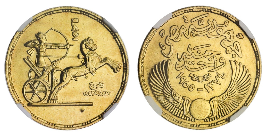 Egypt. Republic. Gin'ey (Pound) AH 1374 - 1955. 3rd Anniversary of the Revolution. Ramses the Great drawing bow in war chariot right, hieroglyphics above, anniversary legend below, rev. Value and date, Gamhuriyya Misriya above, winged sun flanked by uraeus below. KM 387. NGC Unc Details - obv damage. Small dig below chariot. Ex Ted Reams Collection.