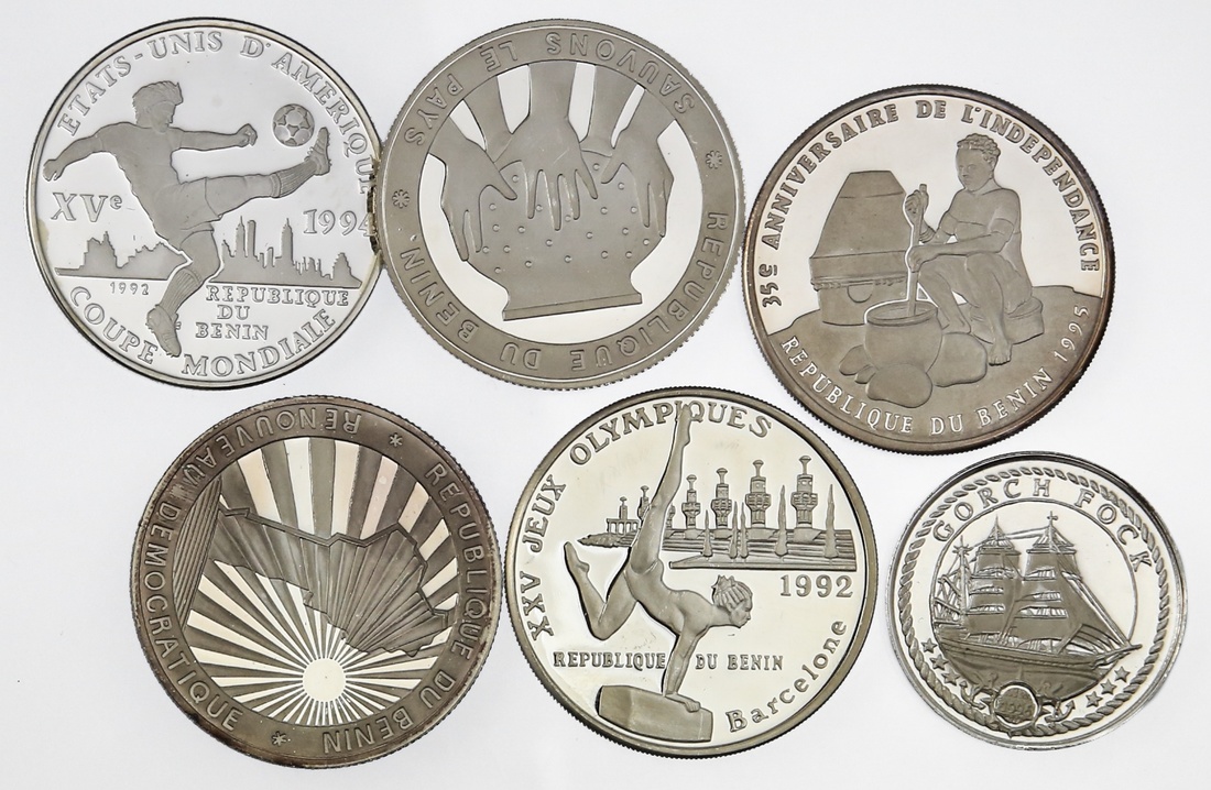 Benin. Quintet of Proof 1000 Francs. ND (1992) -- Hands holding jar, Map with radiant sun; 1992 - Barcelona Summer Olympics, World Cup; and 1995 -Woman stirring pot; also Proof 500 Francs, 1996. The ship `Gorch Fock'. KM 1, 2, 4, 5, 31. Brilliant Proof. (6)