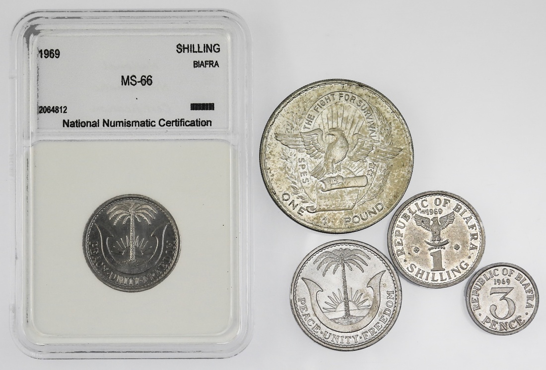 Biafra. Republic (1967-1970). Quintet. Pound; and 3 Pence, Shilling (2), and 2 ½ Shilling, 1969. Defiant eagle on scroll; Arms; Eagle on numeral value; Leopard lying left. KM 6, 1, 2, 4. One of the Shillings - NNC MS 66, the others Uncirculated-BU. (5)