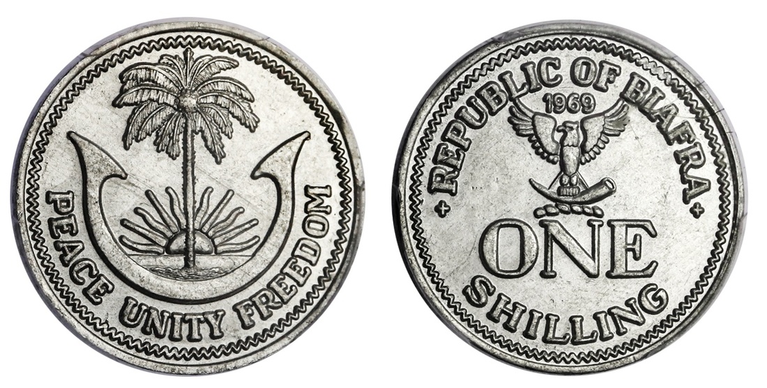 Biafra. Republic (1967-1970). Shilling, 1969. Arms and motto, rev. Value given as "ONE SHILLING". KM 3. Very rare. PCGS MS 64.