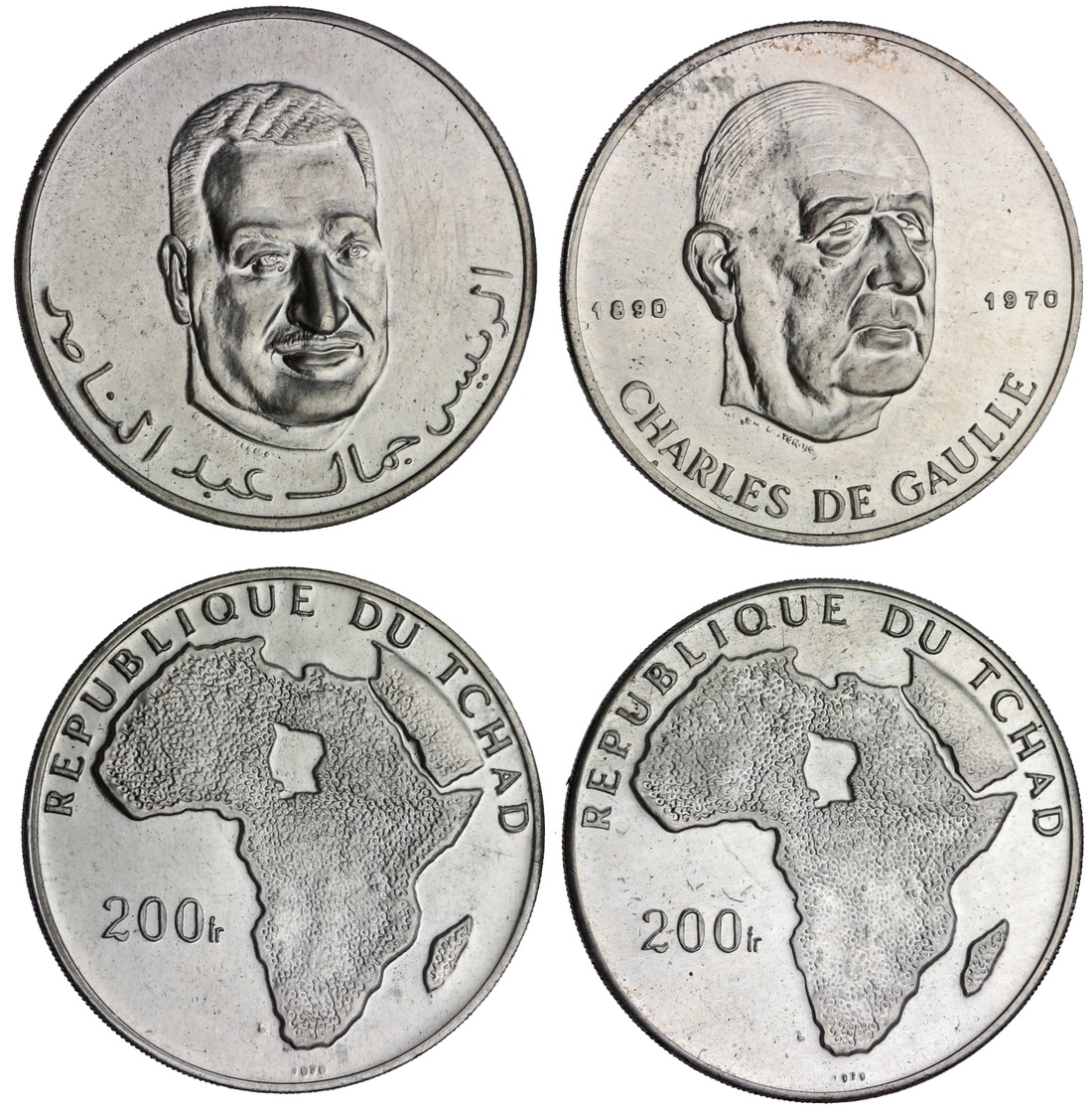 Chad. Republic. Pair of 10th Anniversary of Independence Commemorative 200 Francs, 1970. Brussels. Charles de Gaulle head ¾ right; Gamal `Abd al-Nasser head ¾ right. Rvs. Map of the African continent. Rare with mintages of only 442 and 435 pieces. Brilliant Proof. (2)