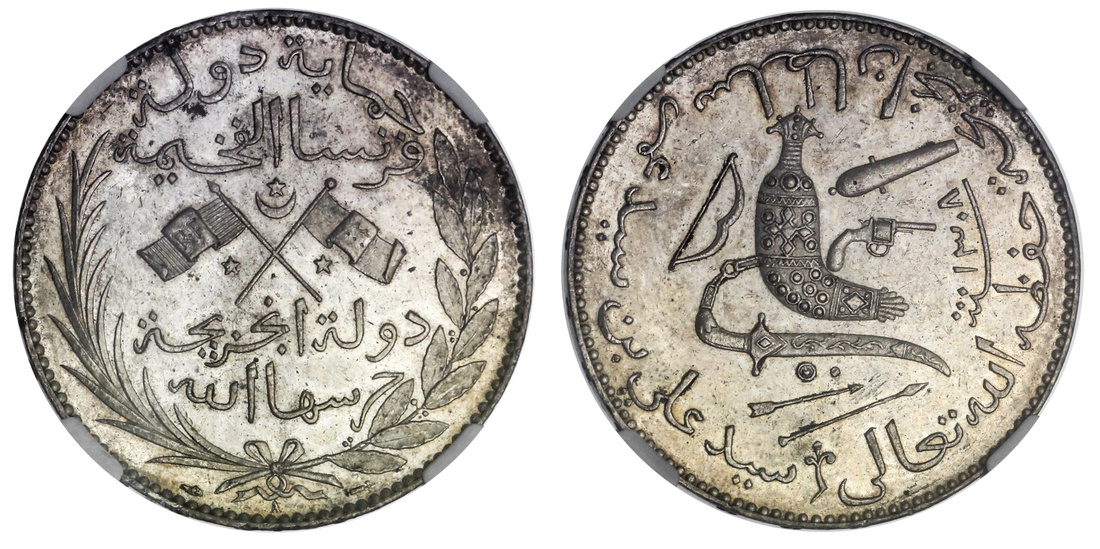 Comoros. French Protectorate. Said `Ali b. Said Amr, of Bambao, ruler of the State of Ngazidja (AH 1304-1311/1886-1893 AD). 5 Francs, AH 1308 A (1890). Paris. Jambiya, cannon, pistol, scimitar, arrows and bow, Arabic legend with ruler's name and titles around, rev. Crossed Comoros and French flags, value in Arabic above ("Five French Dollars") and state name below, in open wreath. KM 3. Rare and popular Crown. Typical light contact marks. Lightly toned, goodly amount of original mint lustre. NGC MS 62.