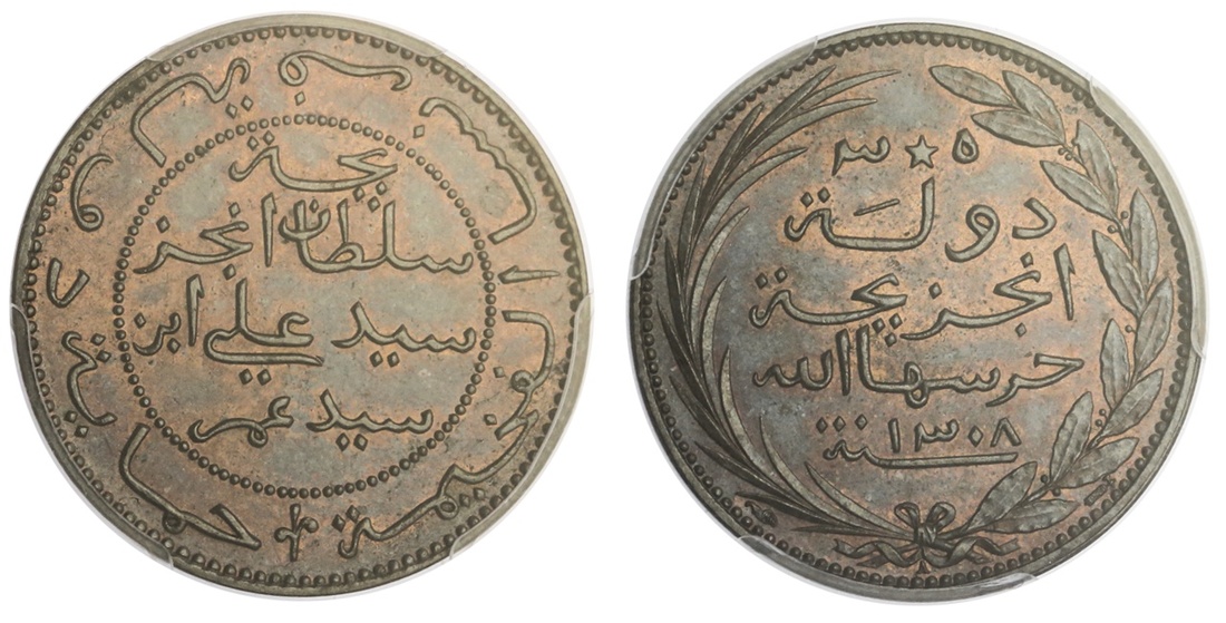 Comoros. French Protectorate. Said `Ali b. Said Amr, of Bambao, ruler of the State of Ngazidja (AH 1304-1311/1886-1893 AD). 5 Centimes, AH 1308 A (1890). Paris, fasces privy mark. Sultan's legend in beaded circle, legend around, rev. State name and date within wreath. KM 1.1. PCGS MS 65 RB. A superb example.