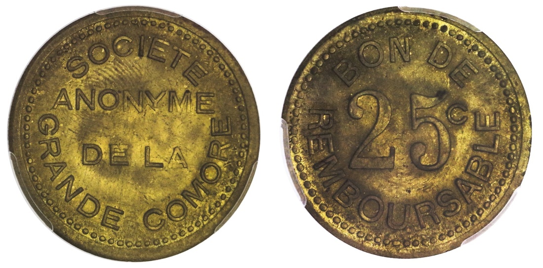 Comoros. Societé Anonyme de la Grande Comore. 25 Centimes Token, ca. 1922. Brass. L.20, KM Tn1a. Specimen strike. PCGS SP 64.