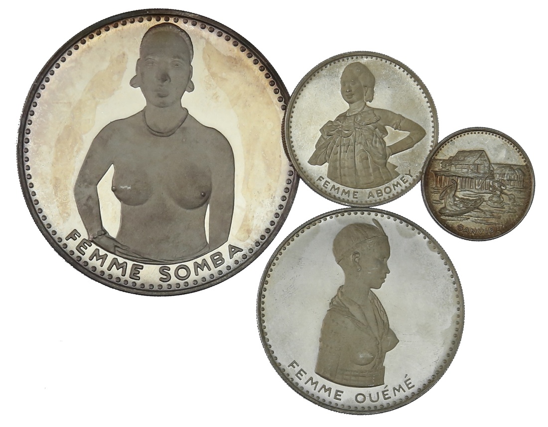 Dahomey. 10th Anniversary of Independence 1971 commemoratives: 100 Francs -Village on Lake Ganvie; 200 Francs -Abomey woman; 500 Francs -Oúeme Woman; and 1000 Francs -Somba woman. KM 1.3, 2.2, 3.1, 4.2. Some light clouding from storage in original holders of issue. Brilliant Proof. (4)