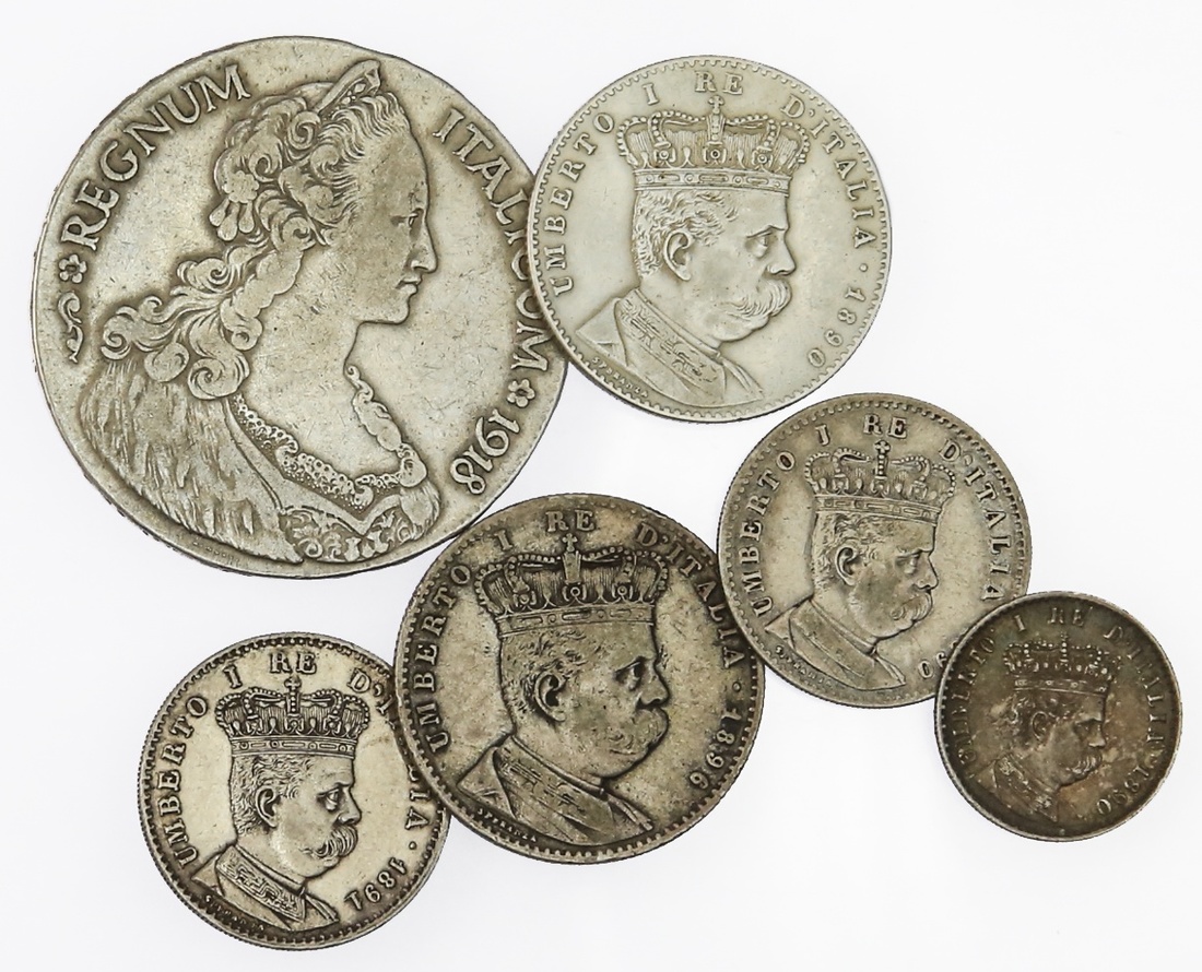 Eritrea. Umberto (1889-1900). Quintet of minors: 50 Centesimi, 1890 M. Attractively toned. Extremely Fine. Lire, 1890, 1891 R. Very Fine and About Extremely Fine, once lightly polished; 2 Lire, 1890 and 1896 R. Cleaned, Very Fine; and Fine-About VF. Crowned bust right. KM 1-3; and Tallero, 1918. KM 5. Once wiped. Very Fine. (6)