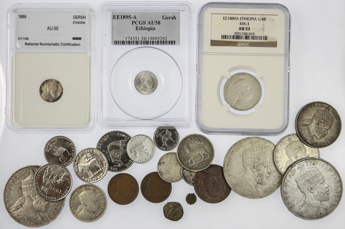 Ethiopia. Menelik II (1889-1913). Type and date grouping. Birr, EE 1887 A, 1889 A (2); ½ Birr, EE 1889 A (2); ¼ Birr, EE 1887 A, 1889 A (NGC AU 53), 1895 A; 1/8 Birr (2), Gersh, EE 1889 A, 1895 A (PCGS AU 58); AEs (3), also: Harar. Billon Mahallak of `Abd al-Shakur, AH 1204; uncertain AE fractional; and a small group of modern Eritrea. Very Fine-AU. (23)