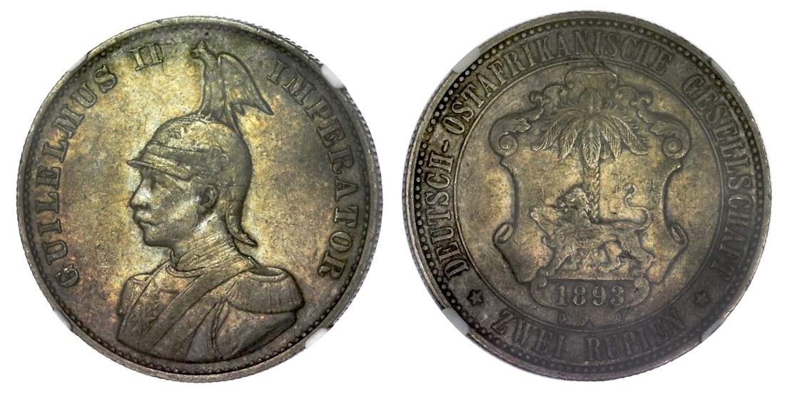 German East Africa. Wilhelm II (1888-1918). 2 Rupien, 1893. Uniformed bust left wearing helmet crested by eagle, rev. Arms. KM 5. Deep battleship gray NGC XF 45.