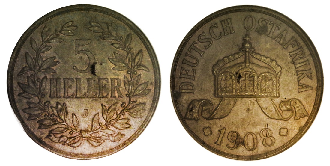 German East Africa. Wilhelm II (1888-1918). 5 Heller, 1908 J. Hamburg. Large crown with ribbons, rev. Value and mm within wreath. KM 11. NGC MS 62 BN.
