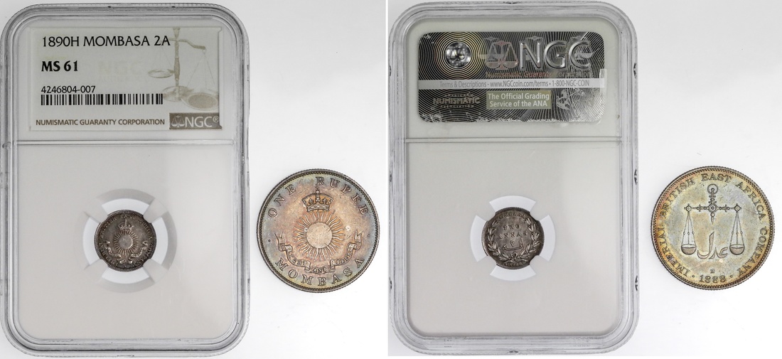 Mombasa. Imperial British East Africa Company. Pair: Rupee, 1888 H. `adl between scales, rev. Crowned radiant sun with Company motto. KM 5. Toned. Extremely Fine; and 2 Annas, 1890 H. KM 2. NGC MS 61. (2)
