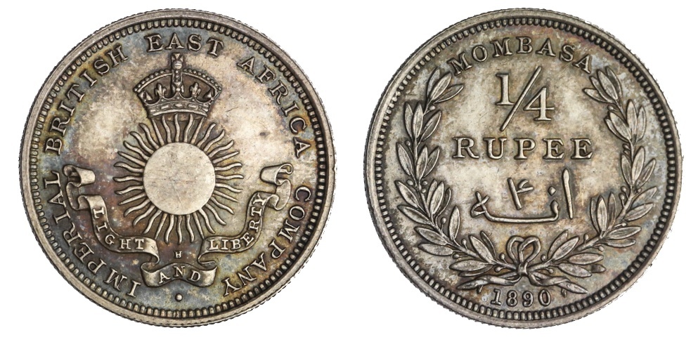 Mombasa. Imperial British East Africa Company. Quarter Rupee, 1890 H. Crowned radiant sun with Company motto, rev. Value, given below in Persian script as 4 Anna within wreath, date below. KM 3. Attractively toned. Choice About Uncirculated.
