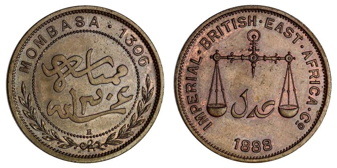 Mombasa. Imperial British East Africa Company. Proof Pice, AH 1306 -1888H. Heaton. Large letters without serifs. Scales, `adl below, rev. In beaded circle: Mombasa sanat 1306 in Arabic, in English above, spray below. KM 1.4. Orange and café au lait tone. Brilliant Proof.