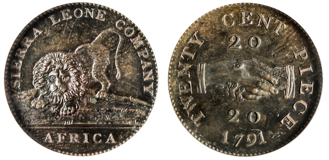 Sierra Leone. Sierra Leone Company. Bronzed Proof Copper 20 Cents, 1791. Lion crouching facing on earthen mound, rev. Hands clasped, numeral value above and below; TWENTY CENT PIECE. KM 4a. Superb orange-chestnut toning with iridescent vermilion and cobalt blue highlights. Lovely coin. NGC PF 64 BN.