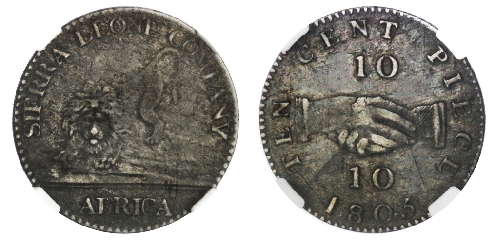 Sierra Leone. Sierra Leone Company. Silver 10 Cents, 1805. Lion crouching facing on earthen mound, rev. Hands clasped, numeral value above and below; TEN CENT PIECE. KM 3. NGC VF 35.