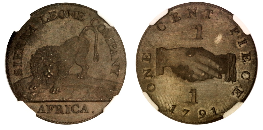 Sierra Leone. Sierra Leone Company. Bronzed Proof Cent, 1791. Lion crouching facing on earthen mound, rev. Hands clasped, numeral value above and below; ONE CENT PIECE. KM 1. Proof mintage of only 400 pieces. Mirrorlike, mahogany tone surfaces, bold details. NGC PF 64 BN.