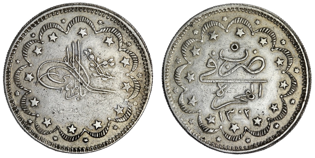 Sudan. Muhammad Ahmad, al-Mahdi (1298-1302/1881-1885 AD). 20 Qurush, Umdurman, AH 1302, year 5. Toughra within circle of crescents and stars, rev. duriba fi hijreh year and date within same border. KM 2. Rare, only crown issue of the Mahdi, struck in the year of the fall of Khartoum and the Mahdi's unexpected death 6 months later. KM 2. About Extremely Fine.