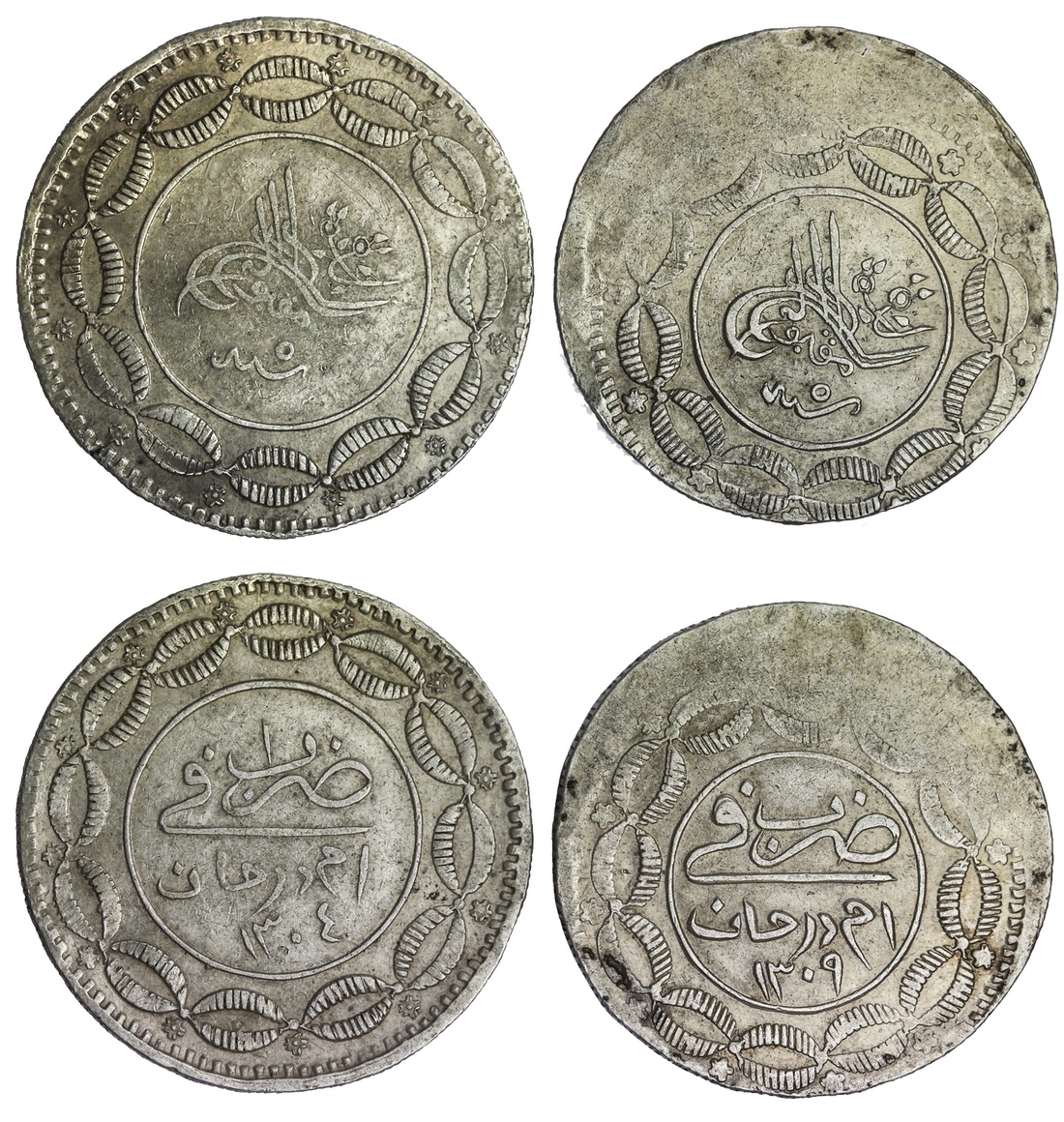 Sudan. `Abd Allah b. Muhammad, "the Khalifa" (AH 1302-1316/1885-1898 AD). Pair of Silver 20 Qurush, Umdurman, AH 1304 year 5 and AH 1309 year 5. Toughra within circle, border of double crescents and stars around, rev. Mint and date in same border, the former with "1" above. KM 7.1, 7.2. Very Fine, the latter with typical weak areas. (2)