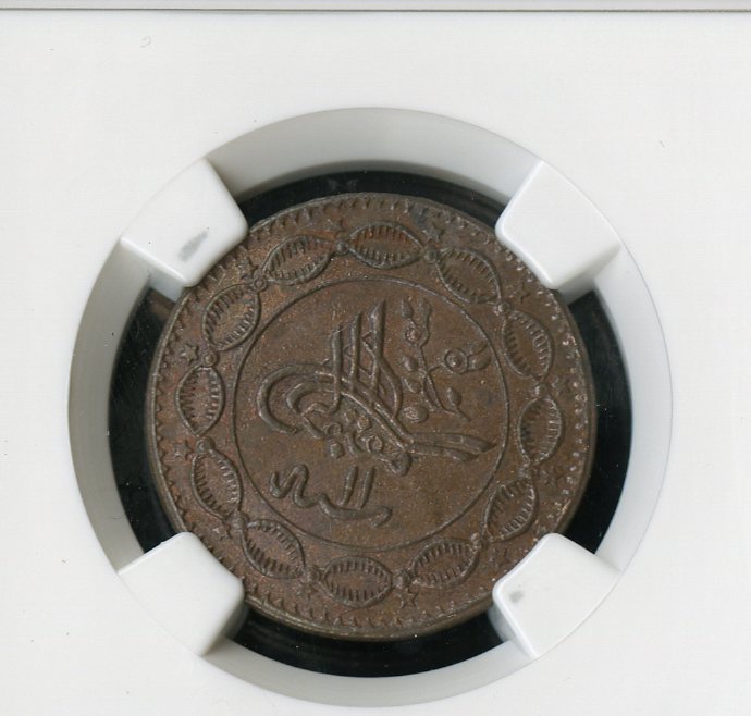 Sudan. `Abd Allah b. Muhammad, "the Khalifa" (AH 1302-1316/1885-1898 AD). 10 Qurush, Umdurman, AH 1311, year 11. Toughra with floral ornament, date below, within circle, border of double crescents, rev. Year, mint and date within same borders. KM 6. NGC AU 58 BN. Bold strike, with goodly amounts of red in the devices. Quite rare so nice.
