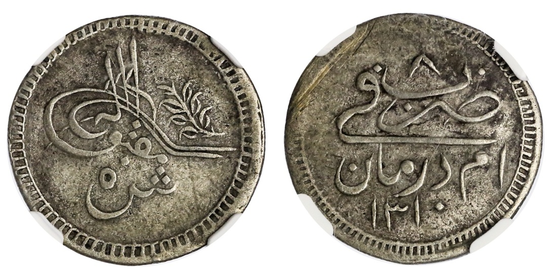 Sudan. `Abd Allah b. Muhammad, "the Khalifa" (AH 1302-1316/1885-1898 AD). 5 Qurush, Umdurman, AH 1310, year 8. Toughra with floral ornament, value below, denticled border, rev. Year, mint and date. KM 11. Very rare. NGC VF Details - scratches (on reverse top left edge).