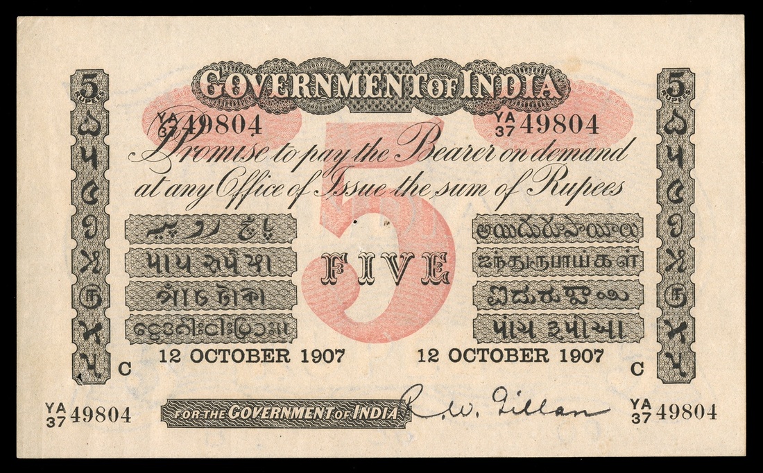 India. Government of India. 5 Rupees. C (Calcutta). Oct. 12, 1907. P-A5d. No. YA/37 49804. Black on pink underprint. Eight language panels, four serial numbers. Gillan. Pinhole, left. Almost Uncirculated. Pick plate note. The paper is fresh and crisp, and the embossing from the serial numbers adds credence to the grade designation.