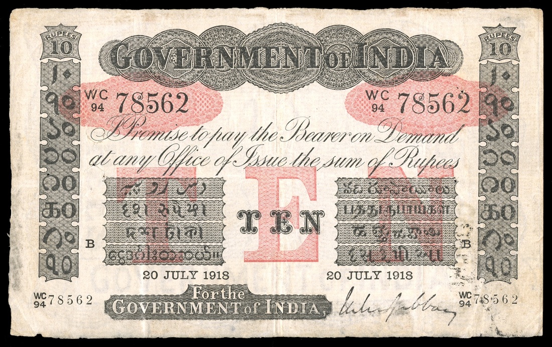India. Government of India. 10 Rupees. B (Bombay). July 20, 1918. P-A10c. R-J 2A.2.3B.4. No. WC/94 78562. Red underprint. Eight language panels, four serial numbers. Gubbay. Spindle holes and pinholes, VF. Ex Spink Sale 12023, lot 6954.