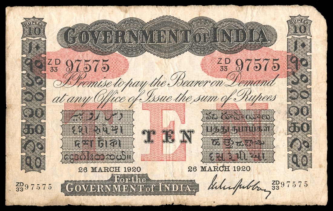India. Government of India. 10 Rupees. Without letter. March 26, 1920. P-A10v. No. ZD/33 97575. Red underprint. Eight language panels, four serial numbers. Gubbay. The upper right corner is rounded, there is some minor age toning, and the bottom edge is a bit rough. Otherwise F-VF.
