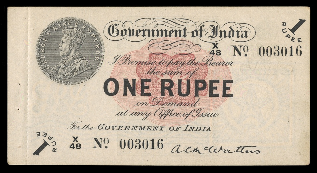 India. Government of India. 1 Rupee. 1917. P-1e. No. X/48 003016. Black on red underprint. Coin depicting King George V, left. McWatters. Water mark is a rayed star in square, right. With perforated stub intact, left. PCGS Choice New 63.