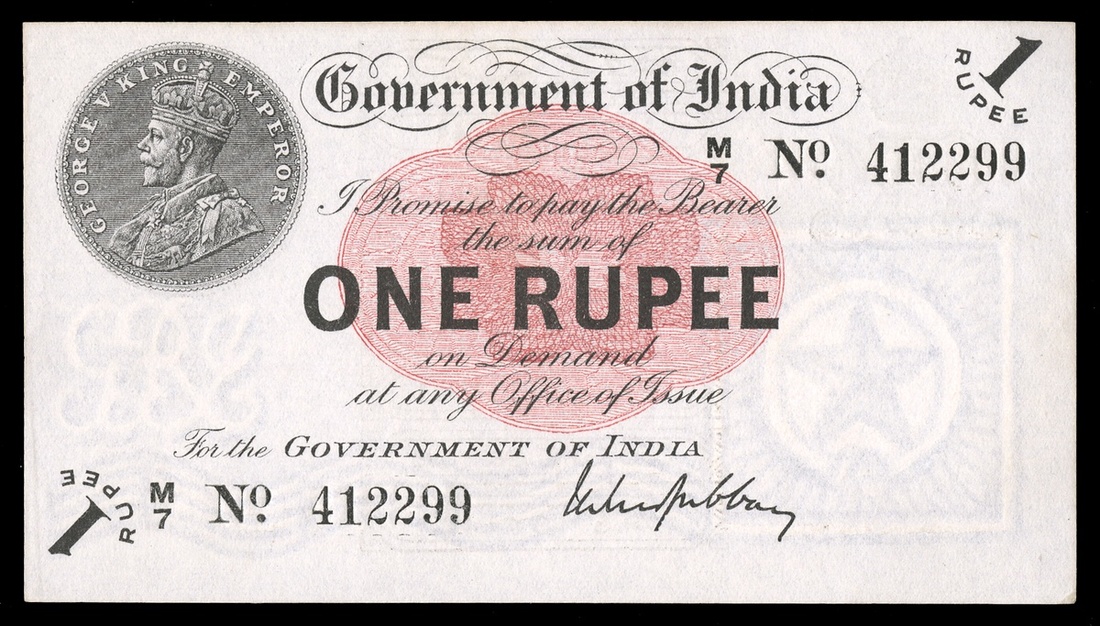 India. Government of India. 1 Rupee. 1917. P-1g. No. M/7 412299. Black on red underprint. Coin depicting King George V, left. Gubbay. Water mark is a rayed star in square, right. Choice Uncirculated. First of two consecutively-numbered examples.
