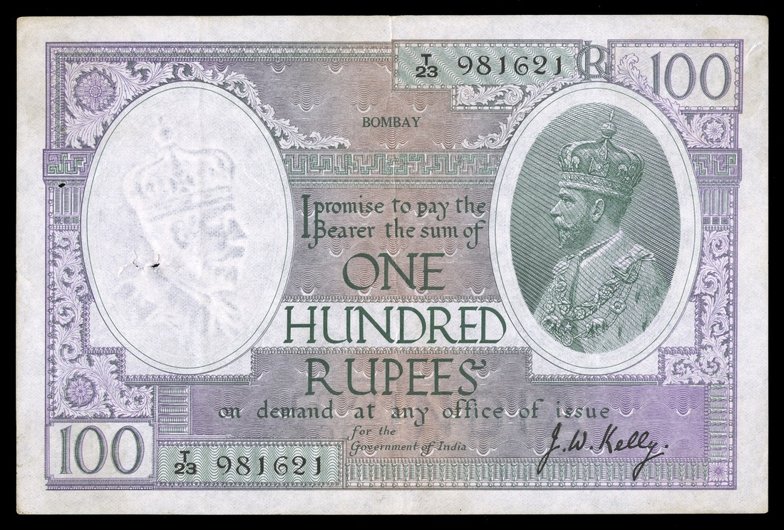 India. Government of India. 100 Rupees. No date. P-10c. No. T/23 981621. Violet and green. Large BOMBAY in green. King George V in oval frame, right. Kelly. Extremely Fine, staple holes, left. Great eye appeal.