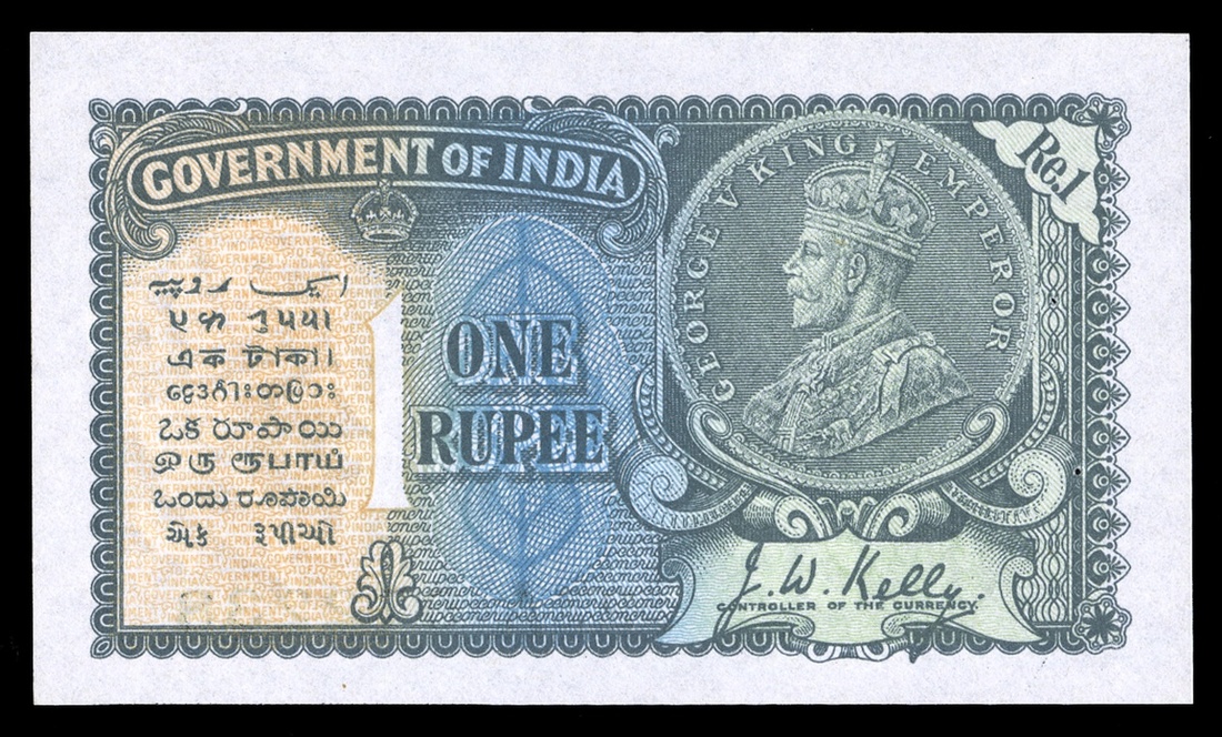India. Government of India. 1 Rupee. 1935. P-14a. No. 27/A 972238. Green-blue. Coin depicting King George V, right. Kelly. Two pinholes. Choice Uncirculated.