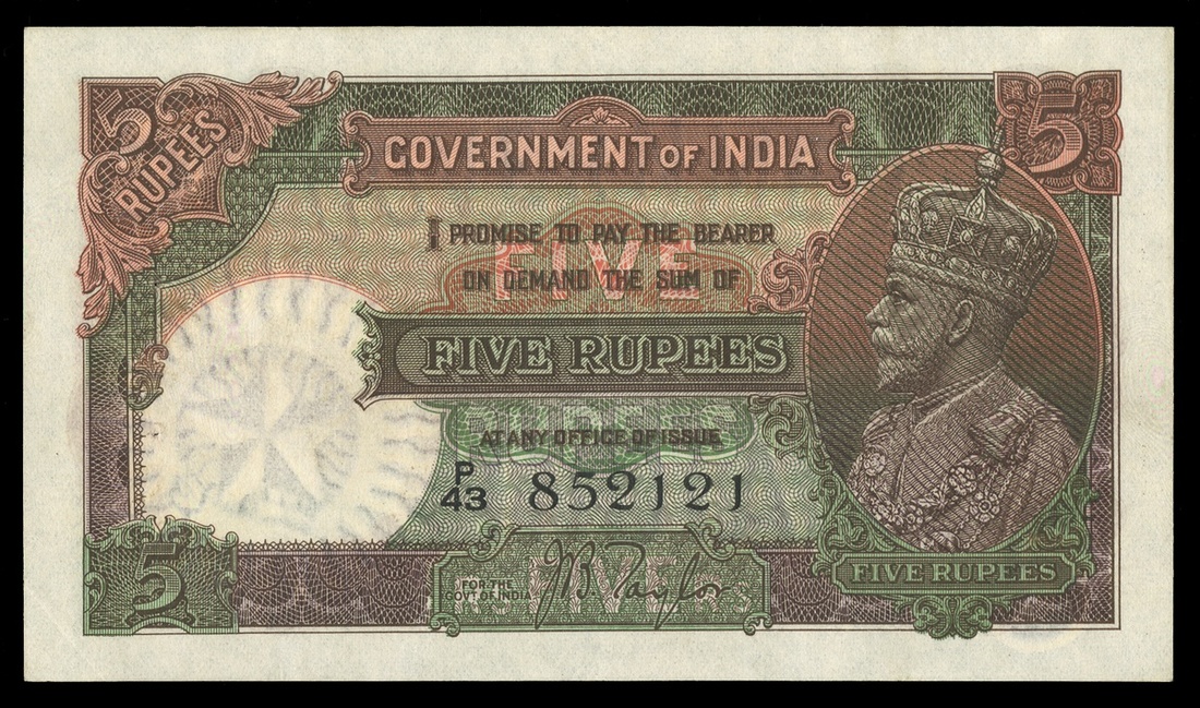 India. British Administration. Government of India. 5 Rupees. ND (1928-1935). P-15a. No. P/43 852121. Signature: J.B. Taylor. Brown-violet, light brown and green. Oval portrait of George V at right, PCGS Extremely Fine 45. Ex Ruth W. Hill Collection.