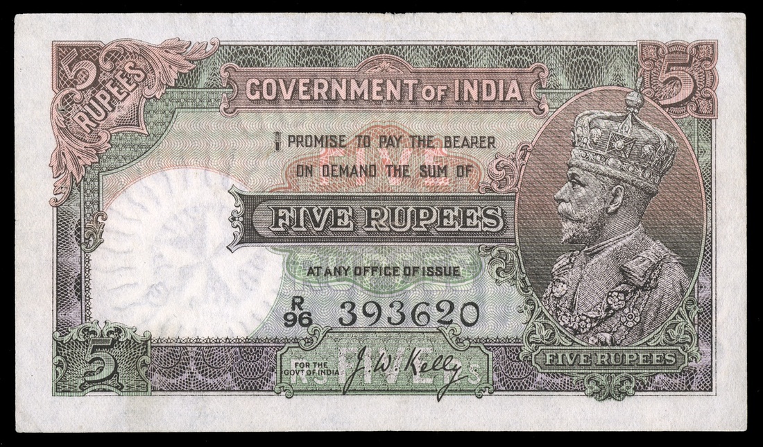 India. Government of India. 5 Rupees. No date. (1926-35). P-15b. R/96 393620. Brown and green. King George VI facing left. Kelly. VF, pressed and looks Uncirculated at first glance. Two pinholes, left.