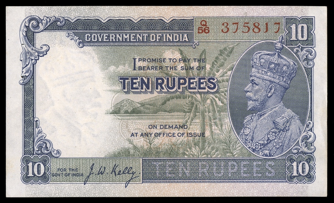 India. Government of India. 10 Rupees. No date. P-16b. No. Q/56 375817. Dark blue. King George V, right. Palm tree, lake and mountains, center. Elephants on back. Kelly. Uncirculated, pinholes, left, light teller handling.