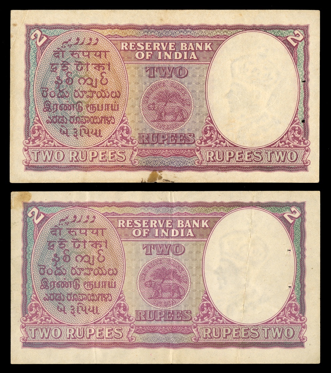 India. Reserve Bank of India. P-17 2 Rupees Grouping No date (1943). Lilac & multicolor. King George VI, right. Deshkukh. P-17a EF; P-17b VF-EF(3), one with a stain, one with an ink notation; CU. [5]