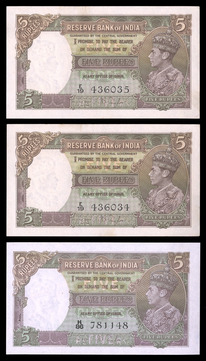 India. Reserve Bank. Trio of P-18a 5 Rupees. No date. (1937). Brown and green. King George VI facing left. Taylor. AU. All with two pinholes, left. [3]