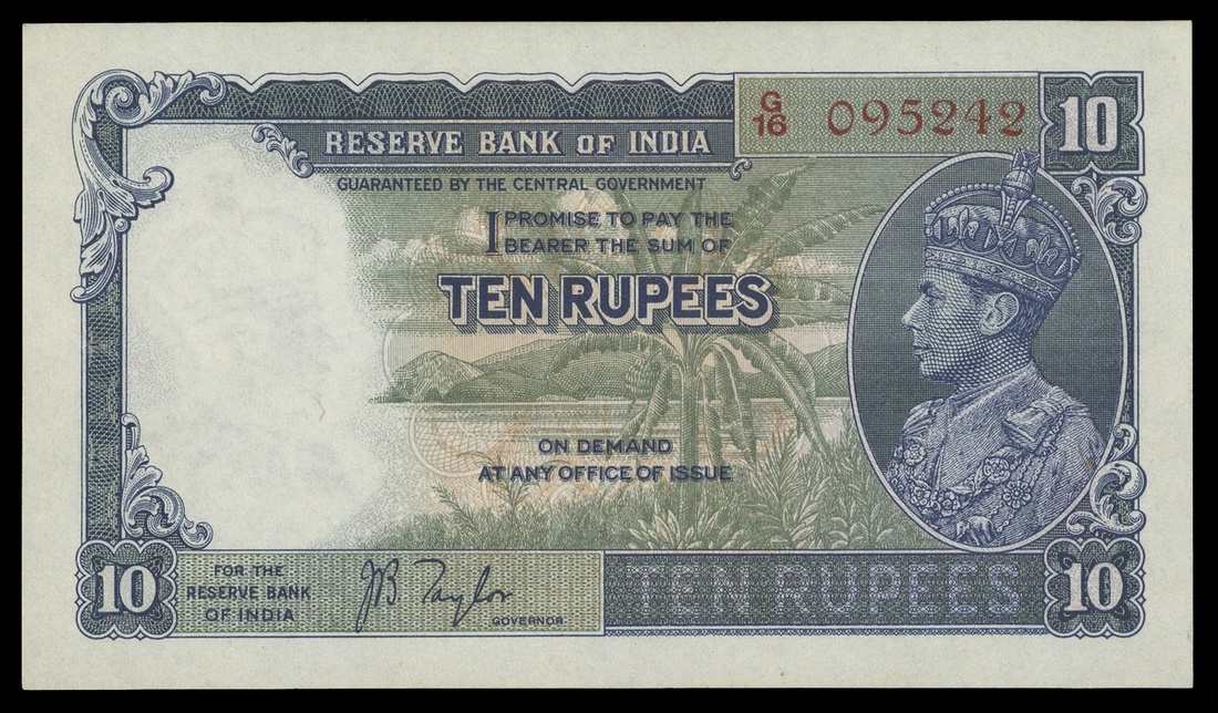 India. British Administration. Reserve Bank. 10 Rupees. ND (1937). P-19a. No. G/16 095242. Signature: J.B. Taylor. Blue-violet and olive. Palm and shore scene at center, George VI at right; Elephants with mahouts flank bank Arms on light blue back. PMG Gem Uncirculated 65 EPQ, staple holes at issue.