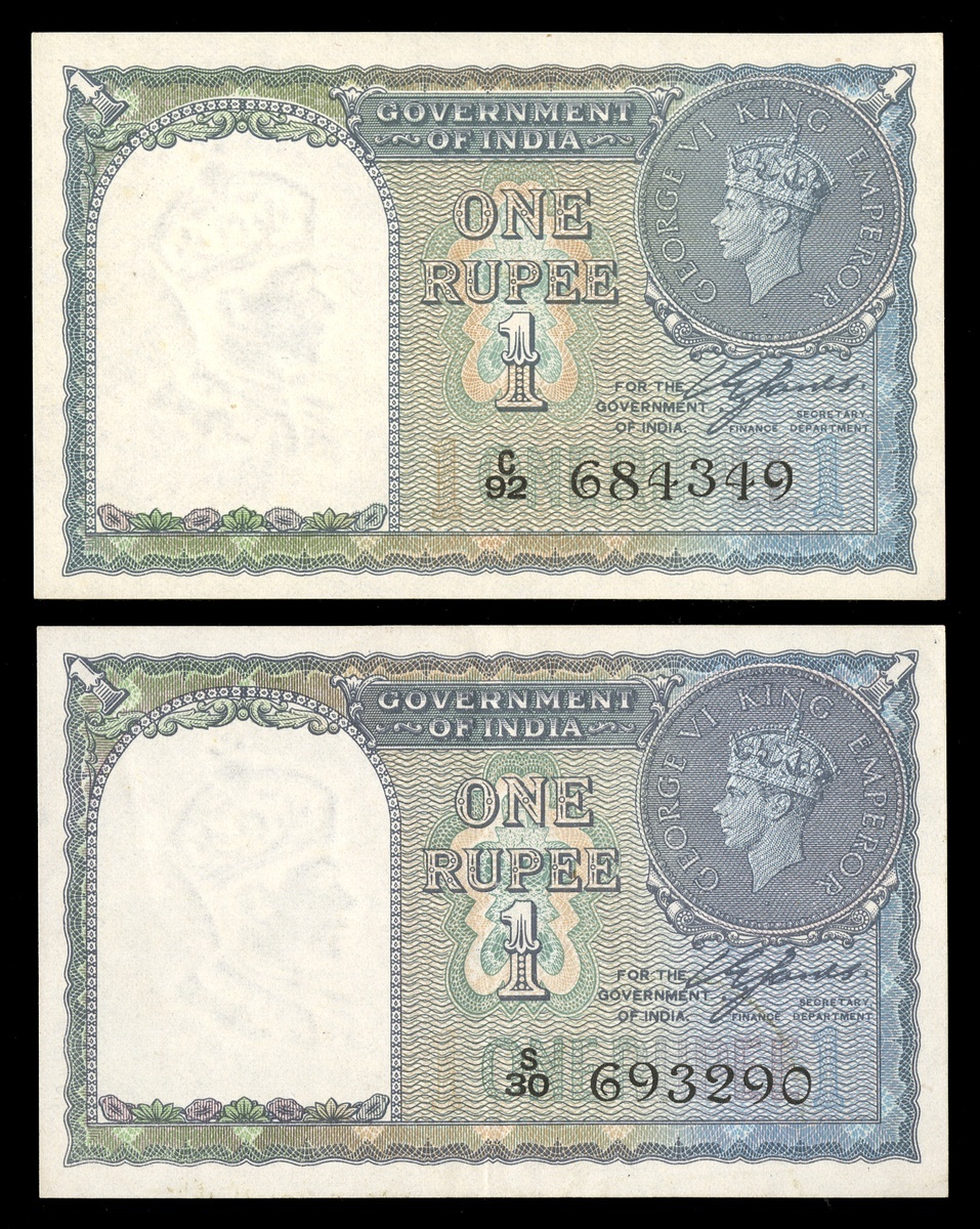 India. Government of India. Group of George VI P-25, 1 Rupee Notes. 1940. P-25a (11) and 25d. Blue-gray and multicolor. King George VI , right. Jones. Uncirculated. Four have pin holes or staple holes. Some are consecutively numbered. Should be seen. Sold as is. [12]
