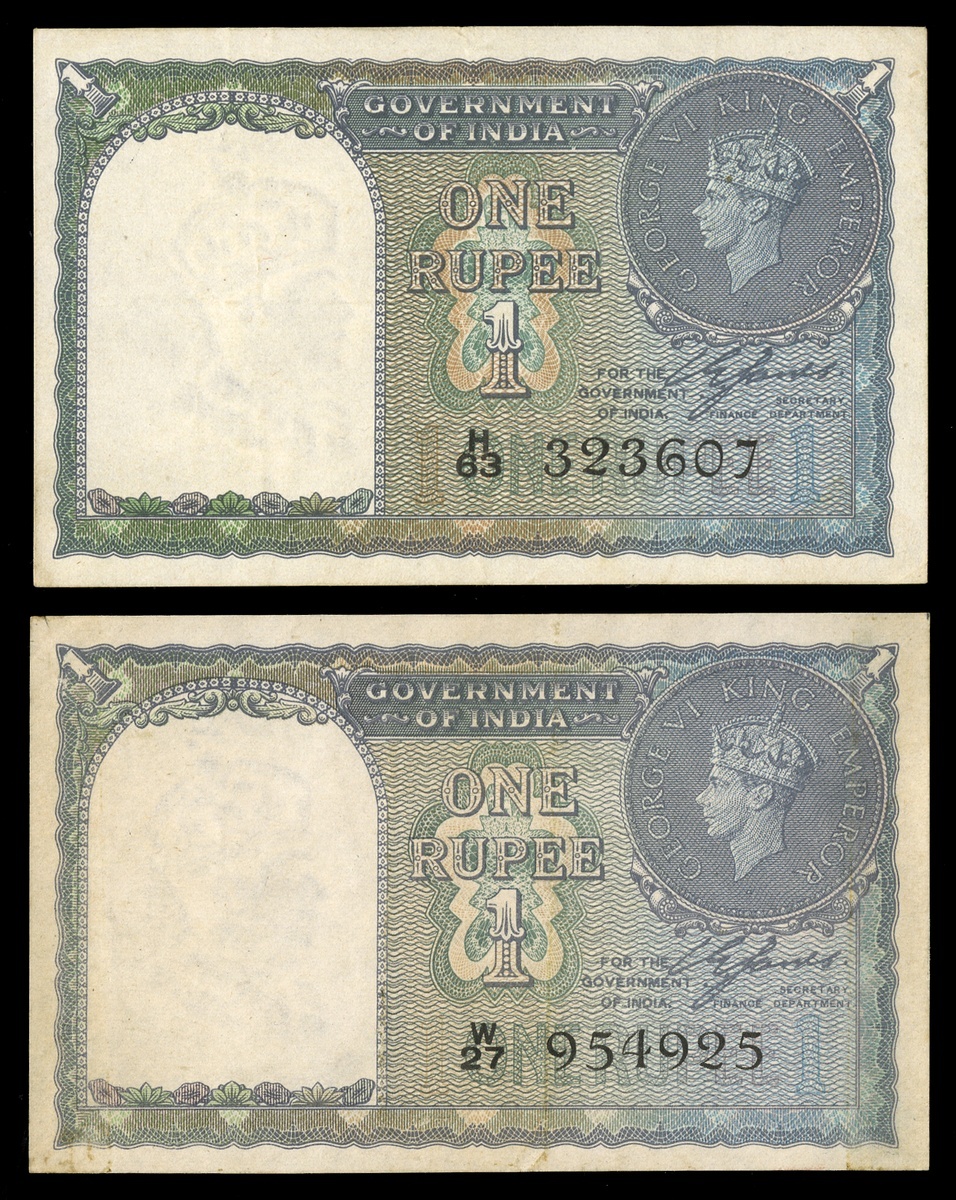 India. Government of India. Another Group of George VI P-25, 1 Rupee Notes. 1940. P-25a (10) and 25d (2). Blue-gray and multicolor. King George VI on dated coin, right. in oval frame, right. Jones. VG-Fine.(6); VF or better(5); AU. Two have spindle holes. Should be seen. Sold as is. [12]