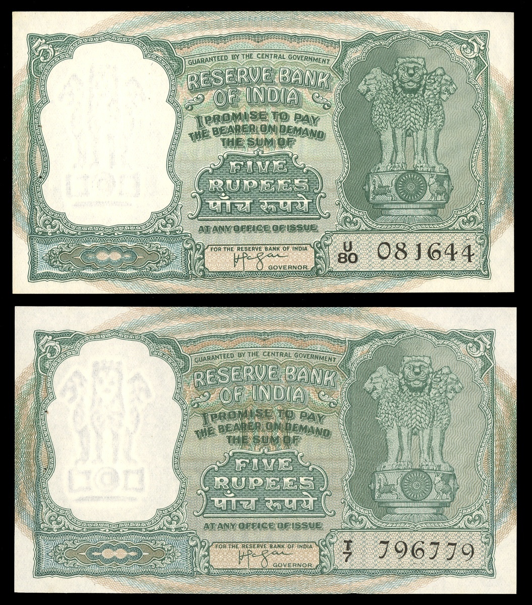 India. Republic. Reserve Bank. Group of P-32 through P-35 5 Rupees. ND. Green on brown. Asoka column, right. P-32Fine with stains and grafitti, AU; P-33 CU(3); P-34 AU; P-35a VF; CU(3); P-35b CU; P-36a CU(3); P-36b CU(3). [17]