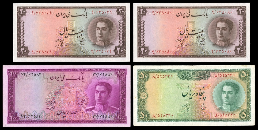 Iran. Pahlavi. Bank Melli Iran. 1948-1951 ND issues: 20 Rials (2). P-48. Second portrait of Muhammad Shah Pahlavi at right; ancient frieze of lion attacking bull on back. Unc.; 50 Rials. P-49. Five figures from Persepolis frieze on back. VF; and 100 Rials. P-50. Palace of Darius on back. EF. [4]