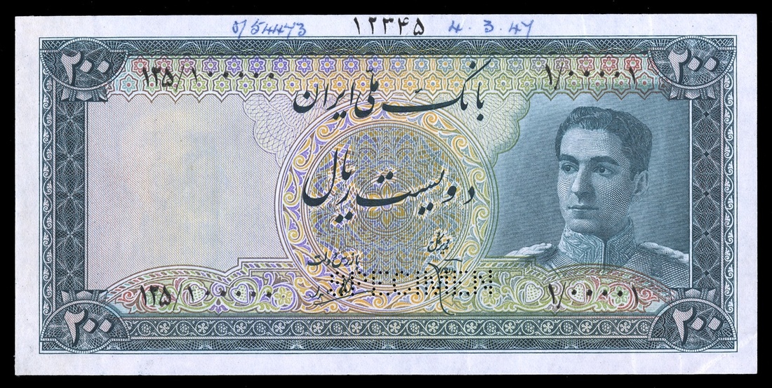 Iran. Pahlavi. Bank Melli Iran. 200 Rials. ND (1947). P-51s. Specimen. No. 125/100000-1/00001-12345. Dark green, light yellow on multicolor. Second portrait of Muhammad Shah Pahlavi in army uniform at right, round tray at center; train crossing railroad bridge in mountains on back. SPECIMEN perforated. Ink annotation with date top margin. Bottom corner crease. EF-AU.