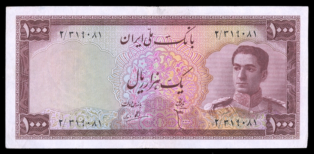Iran. Pahlavi. Bank Melli Iran. 1000 Rials. ND (1951). P-53. Reddish-brown on multicolor. Second portrait of Muhammad Shah Pahlavi at right; Mt. Damavand with river on back. EF.
