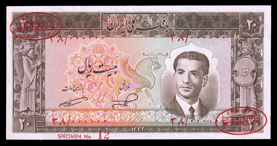 Iran. Pahlavi. Bank Melli Iran. 20 Rials. SH 1332 (1953). P-60s. Specimen. No. 38/000000-12. Dark brown, orange on multicolor. Shah in civilian attire at right, winged bull at center, spear-bearer far right and left; `Ali Qapu Palace in Isfahan on back. Red oval DLR seal top left bottom right. Choice EF.