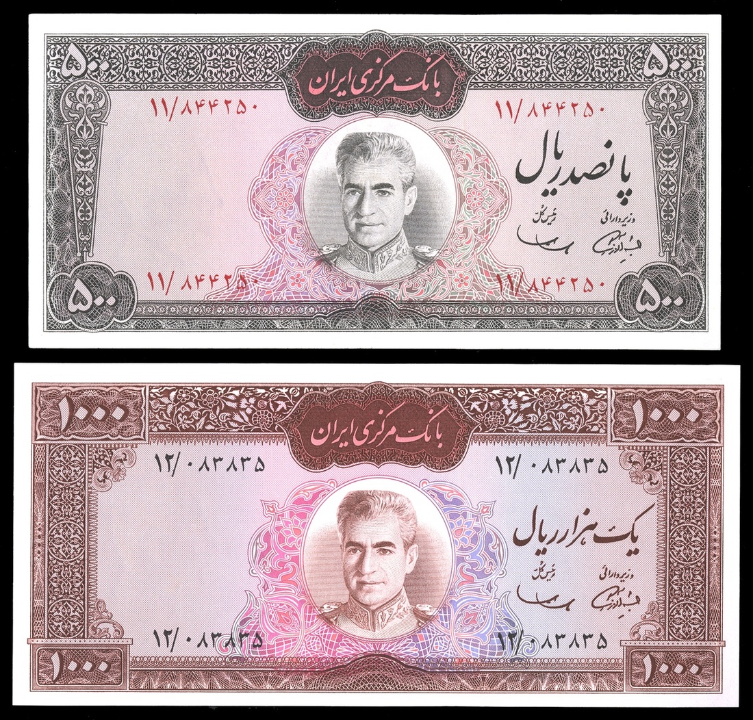 Iran. Pahlavi. Bank Markazi Iran. 500 and 1000 Rials. ND (1969). P-88, 89. Black on pink and purple. Brown on red and violet-blue. Type VII portrait of the Shah at center; Ancient winged horses, Tomb of Hafez in Shiraz on back. The former minor teller handling. Crisp Uncirculated. [2]