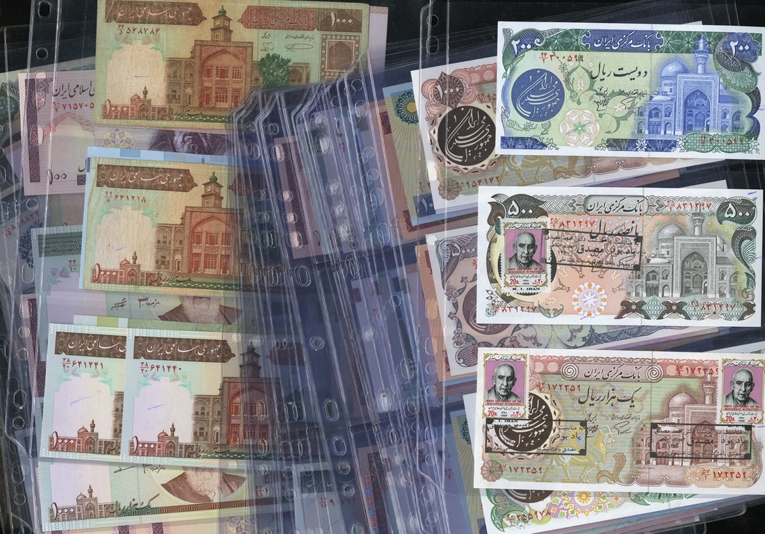 Iran. Islamic Republic. Type, signature collection, 1981-2010; 100 to 100,000 Rials -- most, if not all, types, and a good number of signature varieties. Includes: 5,000 Rials, ND (1981), P-130, 133; ND (1983-93), 139b; and 10,000 Rials, ND (1981) 131, 134a, c (2). Unc. There are also various private colorful commemorative overprints and postage stamp adhesions. Mostly Crisp Uncirculated. [100]