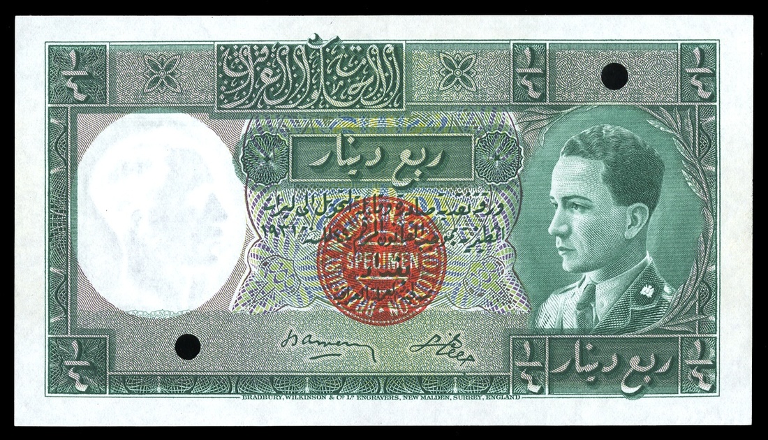 Iraq. Kingdom. Government of Iraq. 1/4 Dinar. Law of 1931 (1933-40 Issue). P-7ap. Specimen. Green. King Ghazi in military uniform at right. Red circular BWC Specimen overprint. Single punch cancels upper right lower left. Crisp Uncirculated.