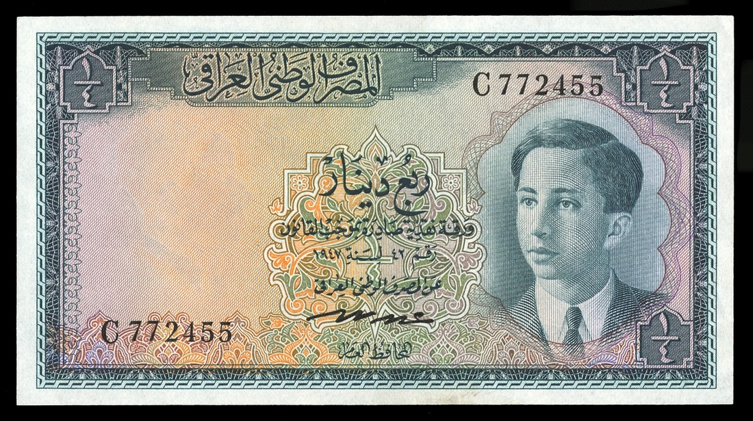 Iraq. Kingdom. National Bank of Iraq. 1/4 Dinar. Law of 1947 (1950 Issue). ¼ Dinar. P-27. No. C 772455. Green on multicolor. Portrait of a young Faisal II wearing a dark jacket at right; date palms back center. Uncirculated. Rare this nice.