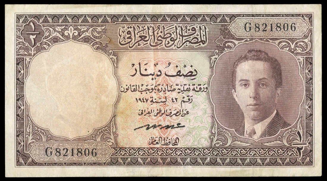 Iraq. Kingdom. National Bank of Iraq. 1/2 Dinar. Law of 1947 - Second Issue (1953). P-33. No. G821806. Brown on multicolor. Portrait at right of Faisal II as an older youth; Spiral minaret, Malwiya Tower at the Great Mosque of Samarra on back. Scarce. Fine-About VF.