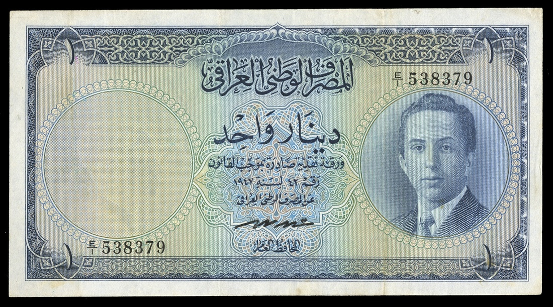 Iraq. Kingdom. National Bank of Iraq. 1 Dinar. Law of 1947 - Second Issue (1953). P-34. No. E/1 538379. Blue on multicolor. Portrait at right of Faisal II as an older youth; Lion of Babylon lower left and right, equestrian statue of Faisal I at center on back. Very Fine.